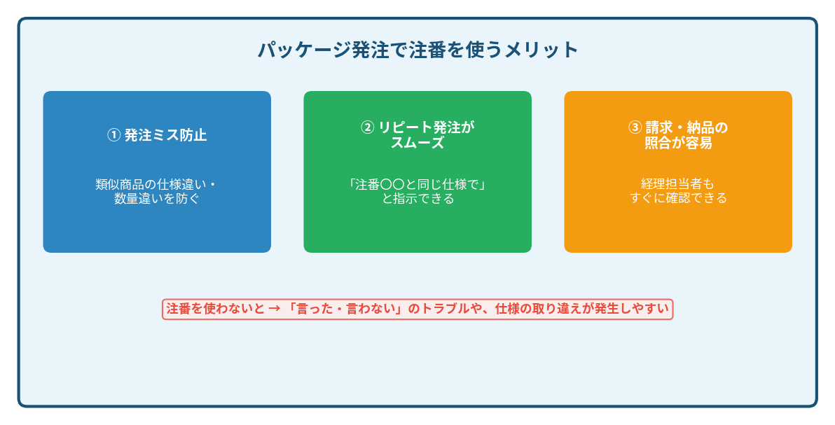 パッケージや印刷物の発注において、注番(および品番)を適切に管理することは、単なる事務作業以上の重要な意味を持ちます。