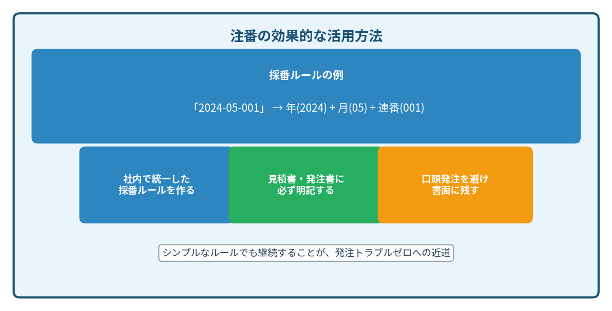口頭での発注は避け、必ず書面(メールやシステムを含む)に注番を残すことが重要です。