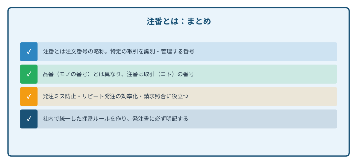 注番は、BtoBの受発注において「取引の履歴」を正確に管理し、発注ミスやコミュニケーションの齟齬を防ぐための重要なツールです。