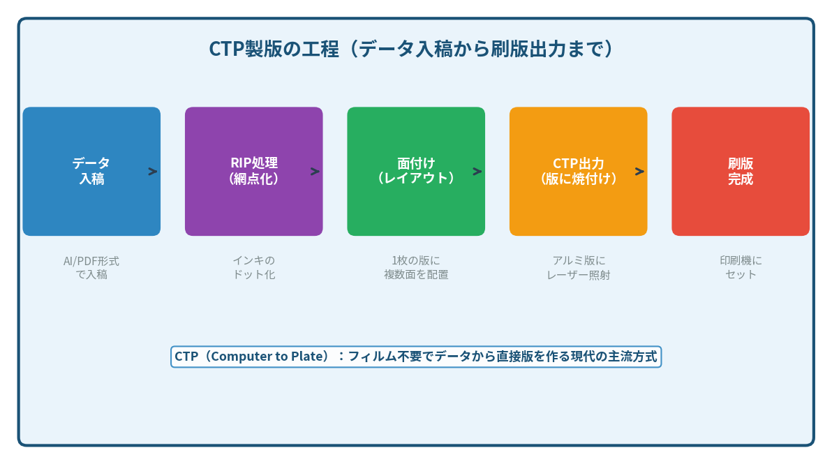 - 版の出力:処理されたデータをもとに、専用の出力機を使って実際の版(刷版)を作成します。
